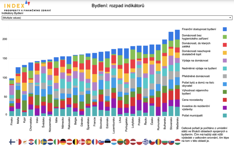 Česko se z pohledu dostupnosti a kvality bydlení umístilo až na 23. místě z 27 zemí EU, tedy mezi pěti nejhoršími státy Unie. Velkým problémem zůstává především dostupnost vlastního bydlení. Průměrný byt dnes vyjde zhruba na 13,6 ročních platů, což je třetí nejhorší výsledek v EU. Zároveň roste počet domácností, které mají s bydlením výrazné finanční potíže. Více než 10 % domácností vydává na bydlení přes 40 % svého příjmu, což Česko řadí na páté místo v EU.